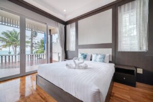 พูลวิลล่า ที่มาพร้อมกับบรรยากาศเงียบสงบ ติดทะเล สไตล์โมเดิร์น ตกแต่งด้วยสีเทาและสีของไม้สุดเรียบหรู โทนของห้องส่วนใหญ่แล้วเป็นสีดำตัดสลับกับสีของไม้คุมโทนไปถึงสีของสระว่ายน้ำ มาพร้อมกับห้องนอนขนาดใหญ่สองห้องในห้อง
